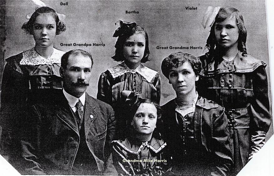 My mother's mother's family. My Grandmother Alice McMorran (the youngest) in front with her mother and father and sisters in back. They lived in a sod hut in Saskatchewan. Not long after this picture was taken my great grandfather was out in the fields and accidently shot himself while climbing over a fence. He died soon after. My Great Gerandma Harris brought up her four daughters on her own.